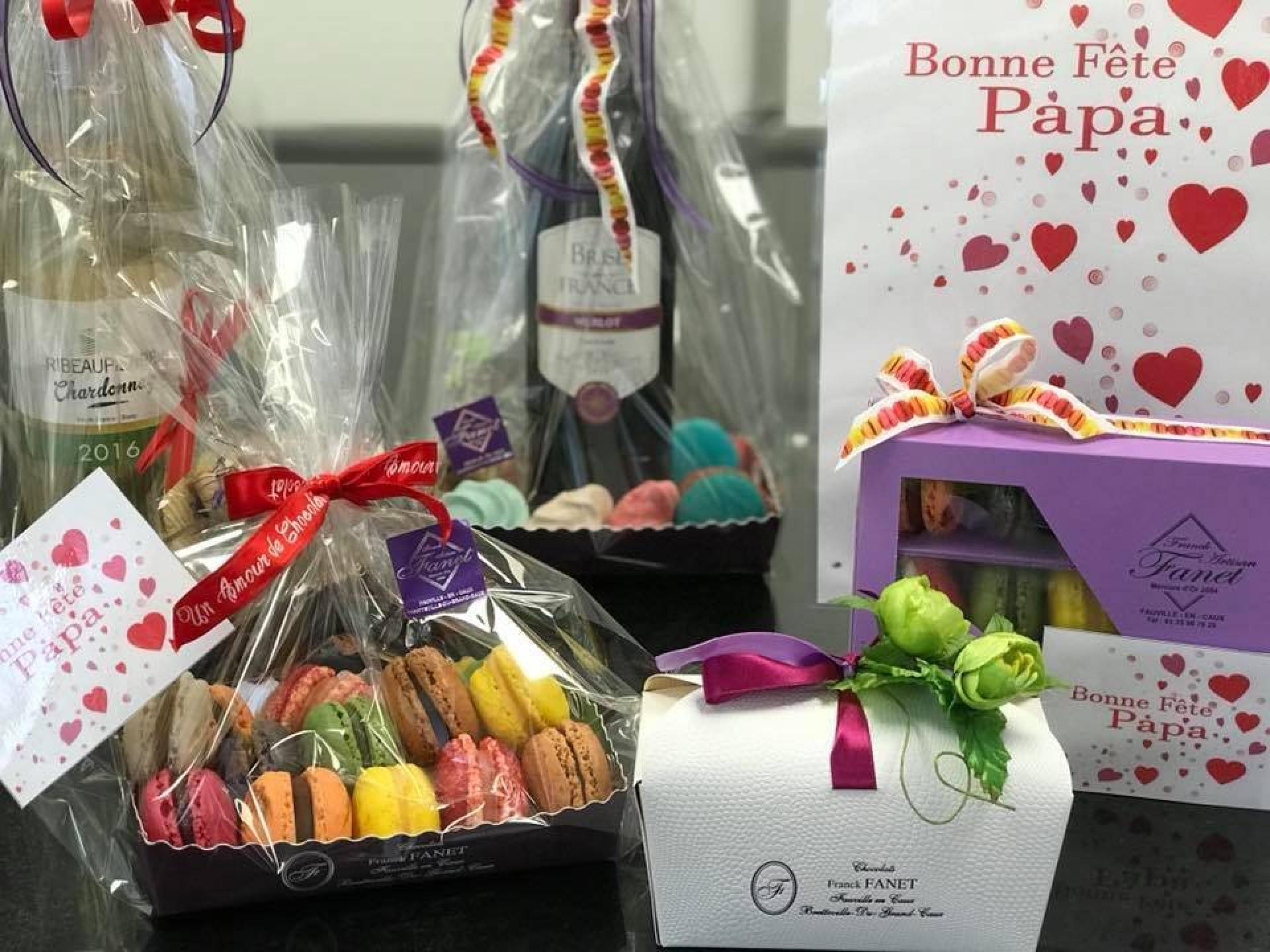 Vous y trouverez des paniers garnis, des présentations de macarons, des ballotins et bien d’autres gourmandises pour faire plaisir à votre papa!