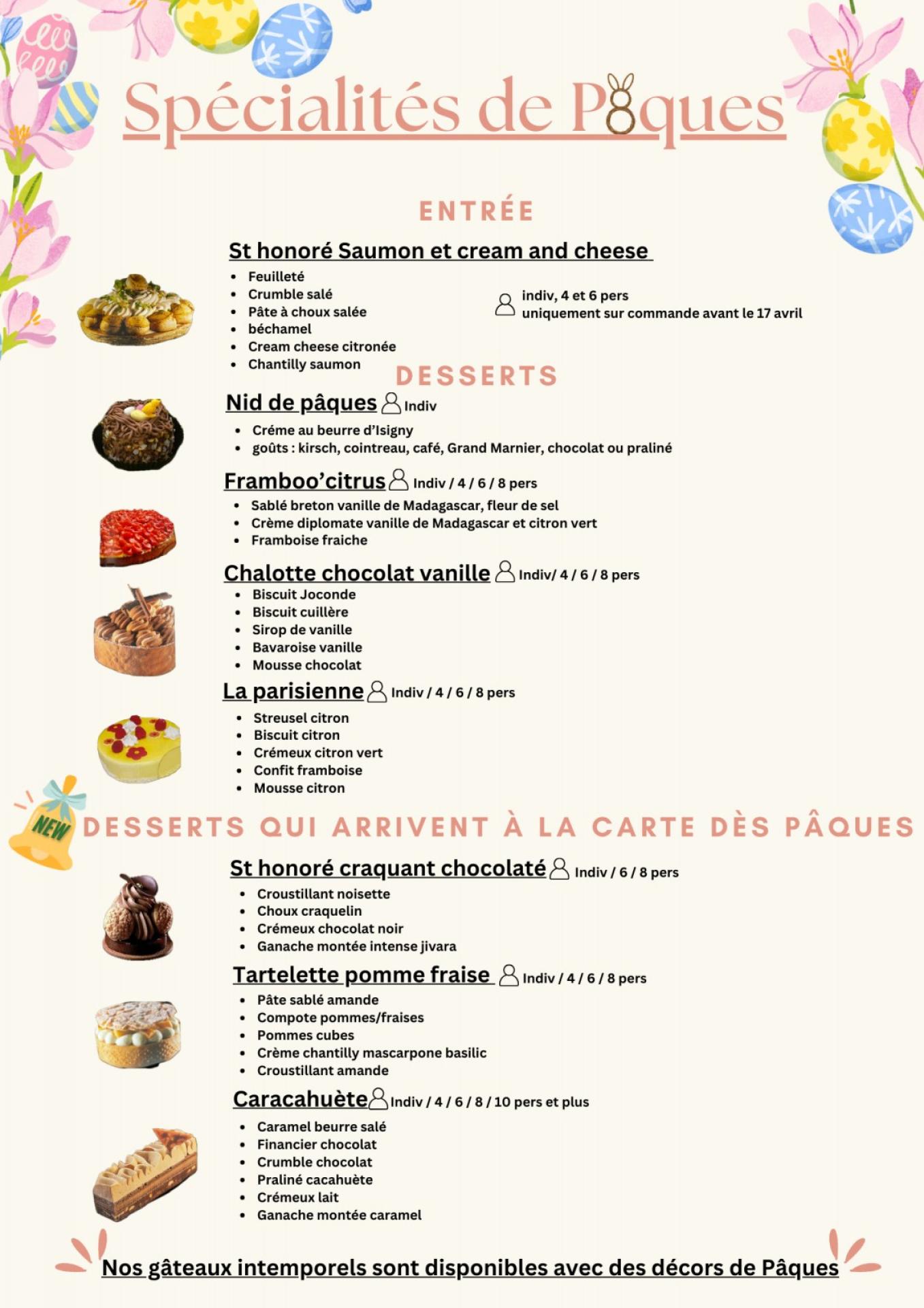 Voici notre menu spécial pour le week-end de Pâques, lundi inclus. Vous y trouverez une sélection de délices faits maison, préparés avec des produits de qualité et un savoir-faire artisanal